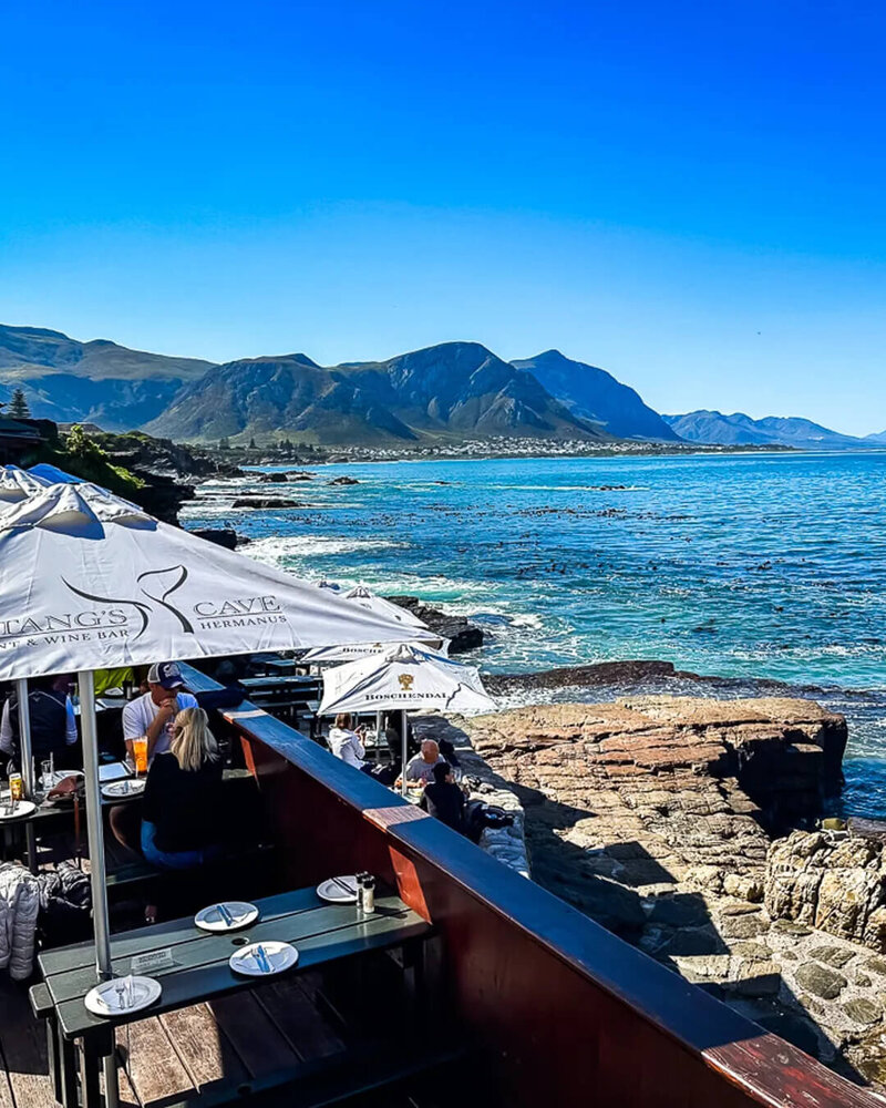 Check into the Harbour House Hotel for two nights. Optional morning round at Hermanus Golf Club's 27-hole layout. Lunch at the renowned Bientang's Cave Restaurant built into the cliffs. Afternoon sundowners at the famous Ficks Bar overlooking the ocean and tidal pools.
