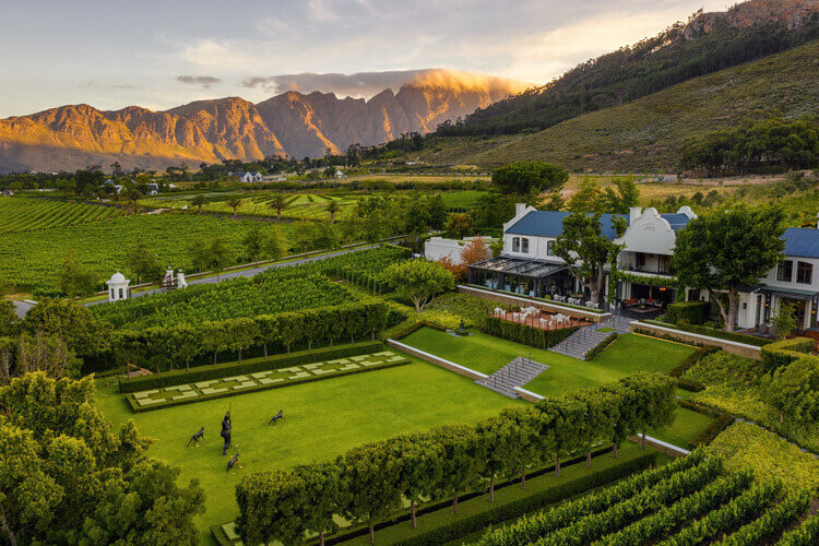 Explore this gourmet capital of South Africa with its French Huguenot heritage, world-class restaurants, and stunning mountain setting. Evening sundowner at Dieu Donné Winery, perched atop the Franschhoek mountains, watching the sun set over the valley with exceptional wines and fine cuisine.